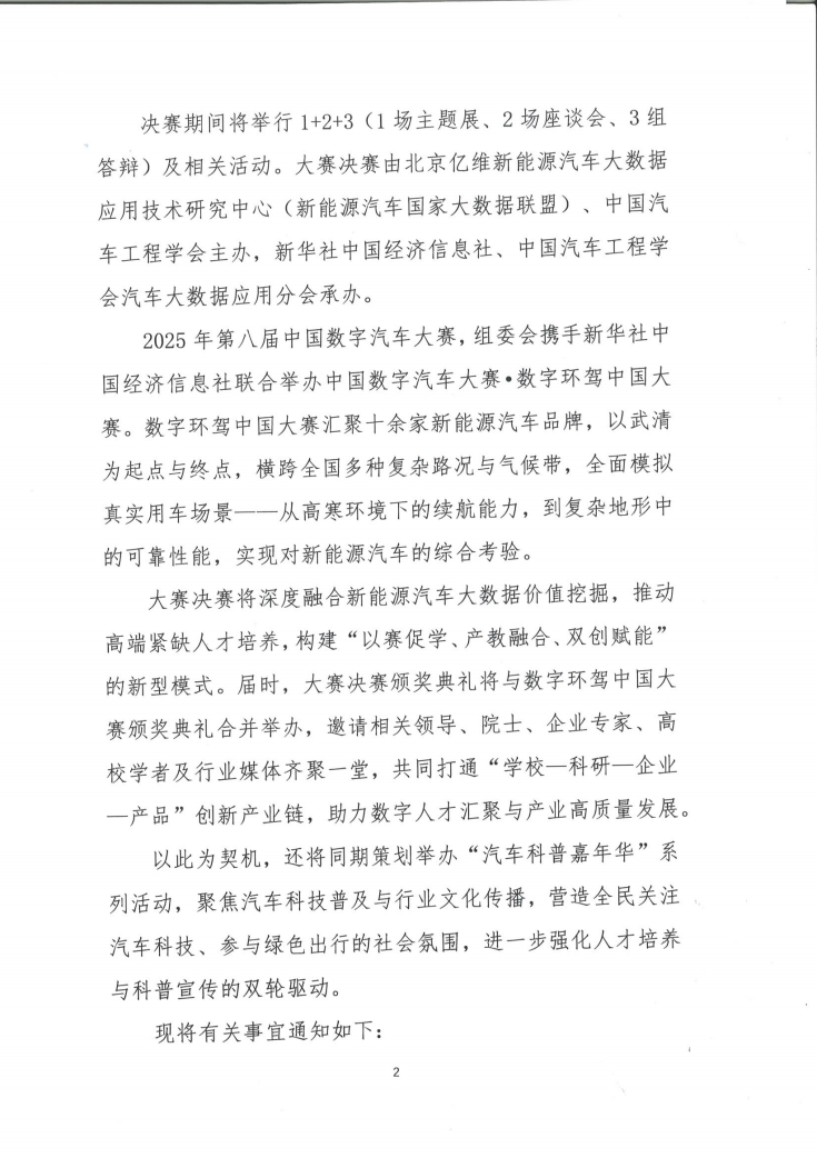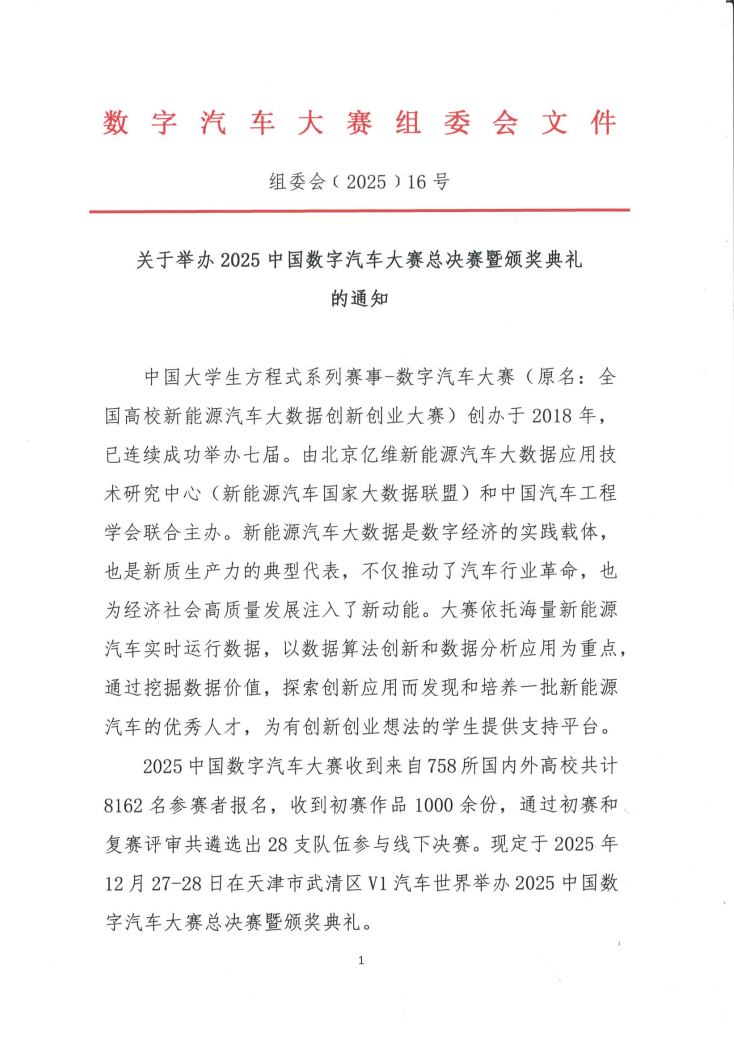 2025中国数字汽车大赛总决赛暨颁奖典礼将于2025年12月27-28日在天津市武清区V1汽车世界举办,现发布关于举办大赛总决赛暨颁奖典礼的通知,决赛期间将举行1+2+3(1场主题展、2场座谈会、3组答辩)及相关活动。