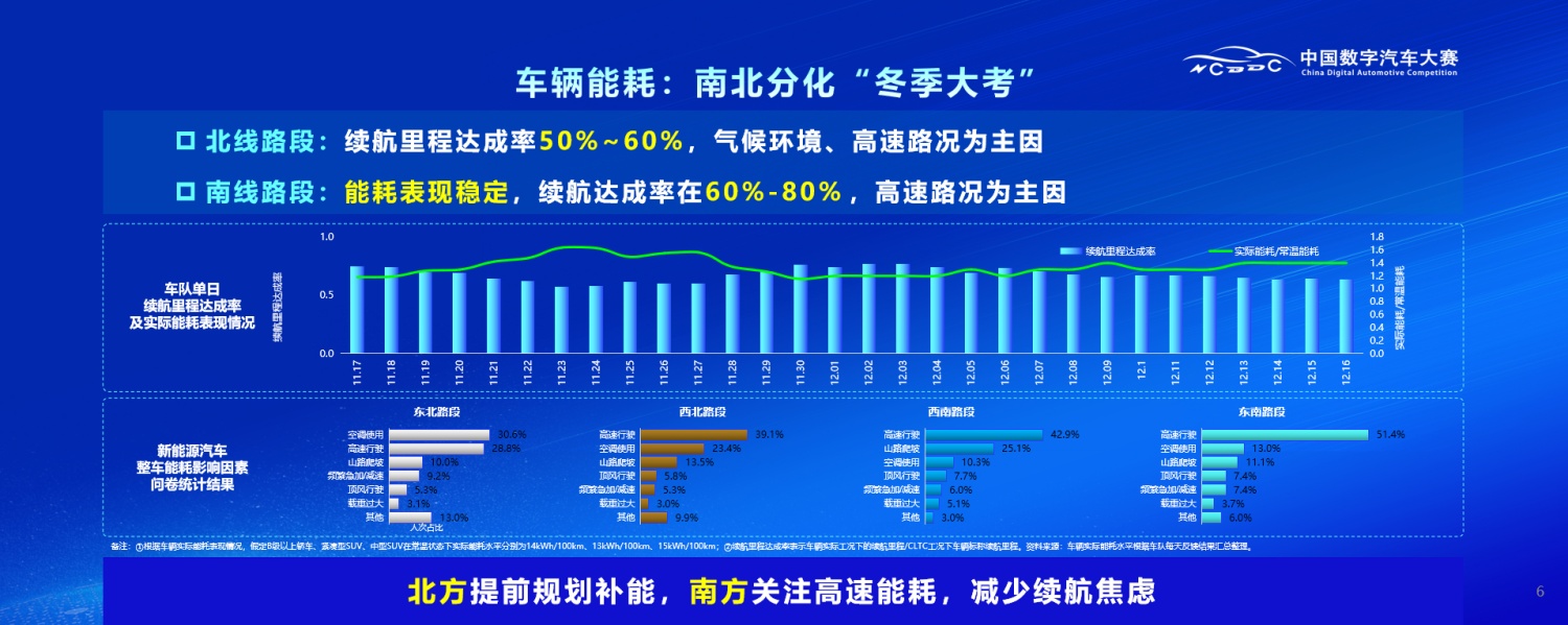 第一车辆能耗,这是用户在使用过程中非常关注的,其实用户关心的层面并不是能耗,而是车辆的里程。环驾路线中北线路段的里程达成率是50-60%,这与低温气候环境主要相关。南线路段因为温差不大,所以车辆能耗表现相对比较稳定,里程达成率在60-80%之间。整体来说,北方因为低温的情况,在车辆补能方面要提前规划和重点关注。在南方的使用过程中,要根据路况和行驶里程的需求,选择是在高速上补能还是周边国道补能,来减少里程焦虑。