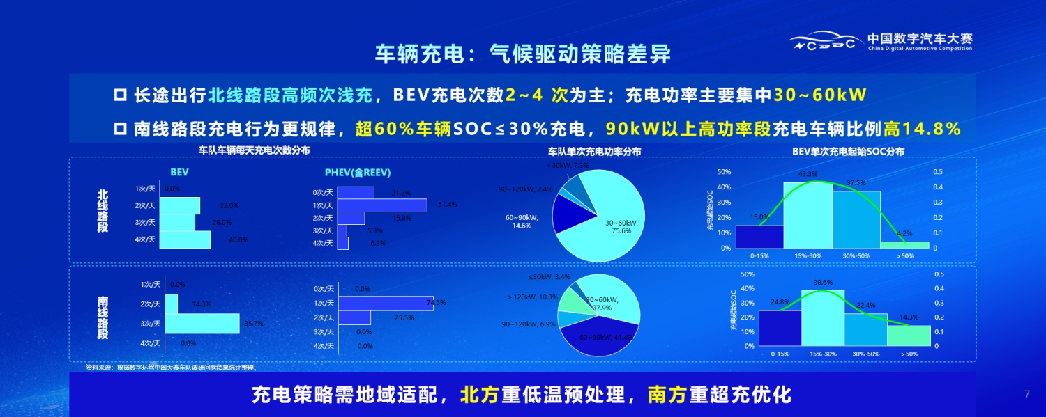 第二充电角度,这也是用户一直提到和关心的问题。在长距离环驾实测当中,北线路段平均每天要充电2-4次,车辆在北方的使用会略显得不那么便捷,而且充电功率主要集中在30-60kW;南线路段因为整体温度更加适宜,我们在驾驶过程当中会更大胆一些,60%以上的车辆都是在SOC降到30%以下才去充电,90kW以上的高功率充电占比也比北方低温时高14.8%,整体来说充电的便捷性更好。所以未来的车辆设计也要考虑充电策略和地域进行适配,北方关注在低温条件下的预处理,如何提高充电的效率;南方对超充的需求更大,需要在这方面做适当优化。